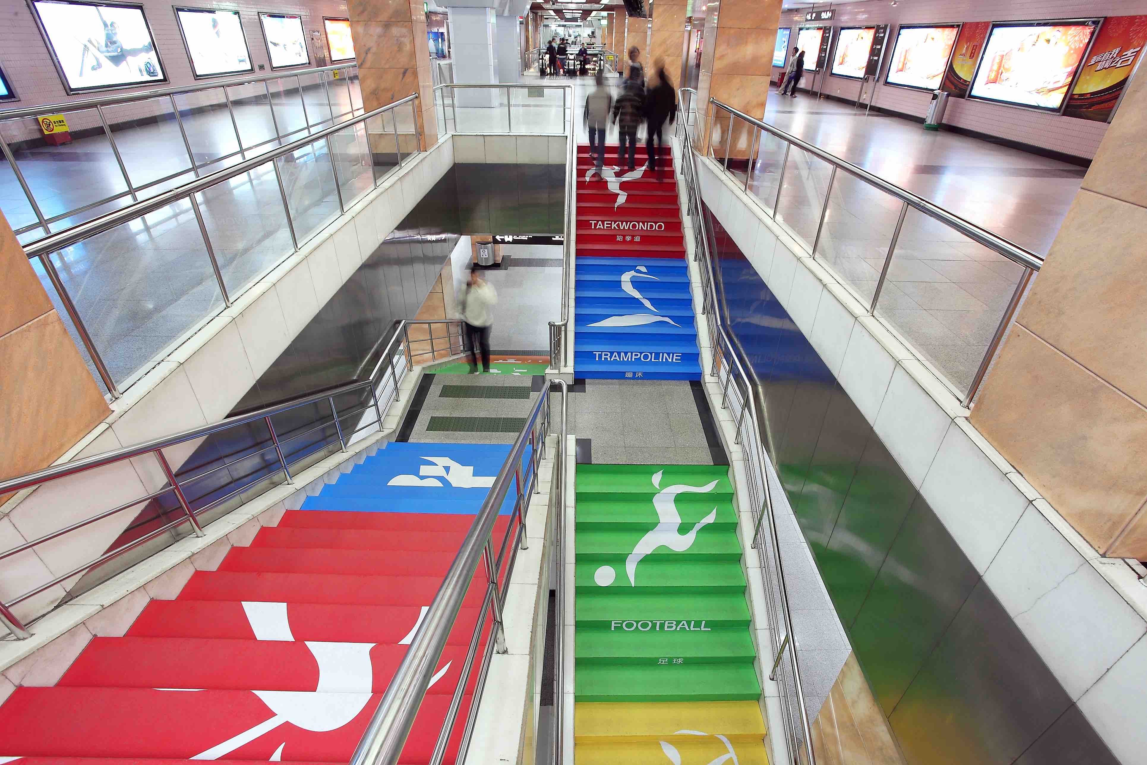 利用扶梯上方空间、楼梯等设施,以玻璃贴、地贴等形式,进行巧妙的空间视觉设计,突破视觉极限,展示地铁奇妙的空间设计,让乘客感受浓浓的亚运气息。